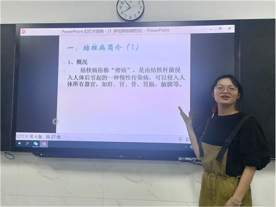辅导员以PPT、播放动画视频、案例法、问卷知识答题等形式让员工了解什么是结核病、结核病怎么治疗、如何预防感染结核病。重点强调了公司关于结核病防治的要求,首先,需要对结核病相关知识有科学认识,做到不信谣、不造谣、不传谣,掌握结核病的可疑症状、传染途径,增强自我保护意识。其次,公司教室、寝室等室内场所要保持通风,加强空气流通,对空气消毒,降低结核病传染风险。最后,员工个人应加强锻炼,提高自身免疫力,保持良好作息习惯。同时还要保持健康的心理,对结核病传染不产生过度焦虑。