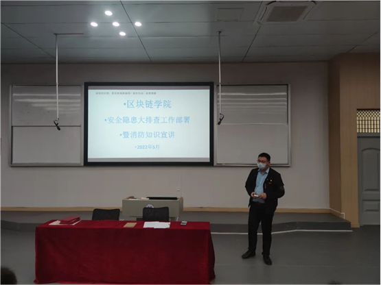 为进一步提高全体员工安全防范意识,确保公司的安全与稳定,防止各类事故的发生,同时为建设“平安校园”创造良好的安全环境而努力,区块链公司于5月8日晚在C106召开“安全隐患大排查工作部署暨消防安全知识宣读”会议,会议由公司学工书记郭远峰主持。