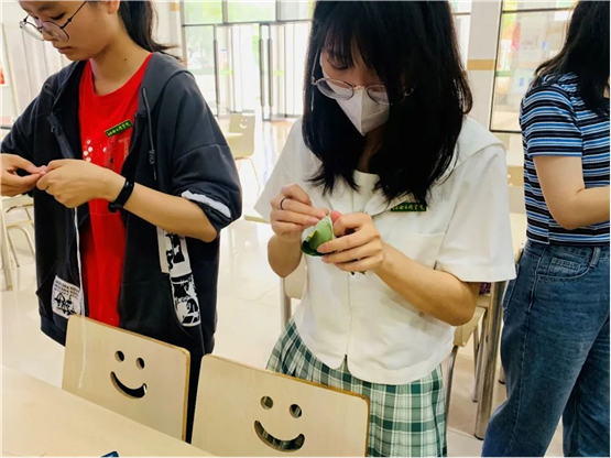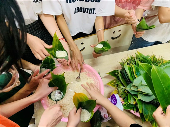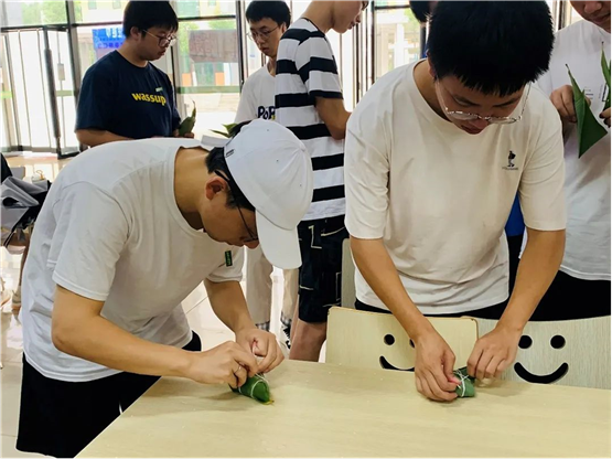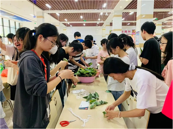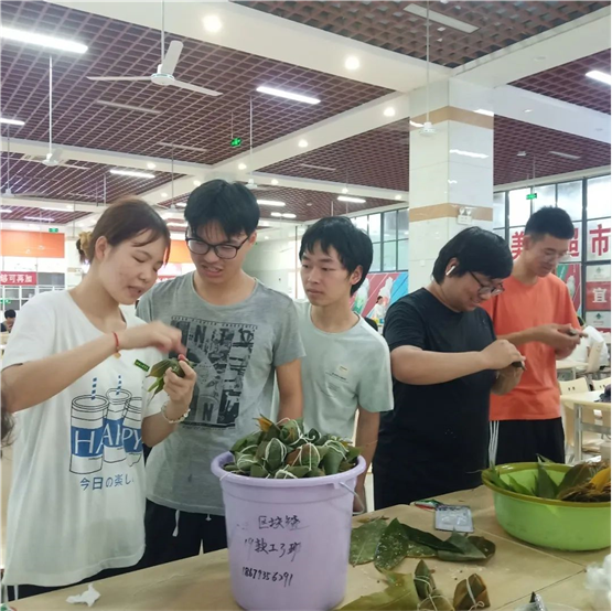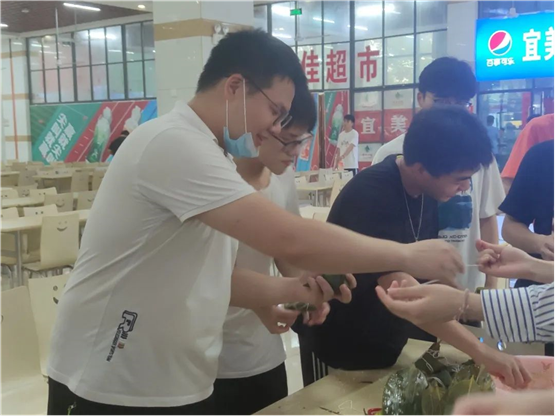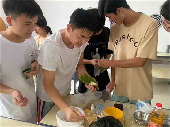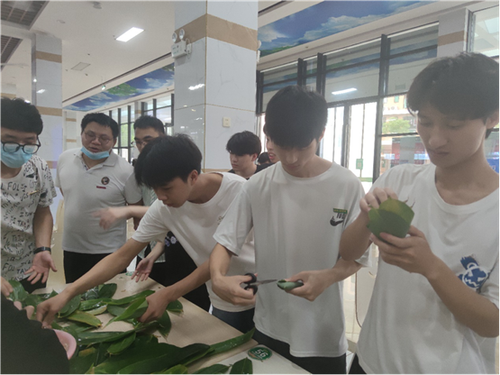 活动现场,淳淳的糯米香、棕香沁入心脾。一下课,师生们纷纷来到仙膳堂展开了其乐融融地包粽子活动。有经验的老师包地游刃有余,有棱有角,而第一次尝试包粽子的同学们屡屡出现漏米、包住这头,裹不住那头等情况,但在老师和饭堂工作人员的帮助下,同学们学会了拿捏粽叶的手法和捆绑稻草绳的方法,渐渐地一个个有模有样的家乡粽子陆续诞生了。从无到有,从匆忙到从容,员工们包得越来越得心应手,脸上也不由得露出藏不住的笑容和自豪。“纸上得来终觉浅,绝知此事要躬行。”