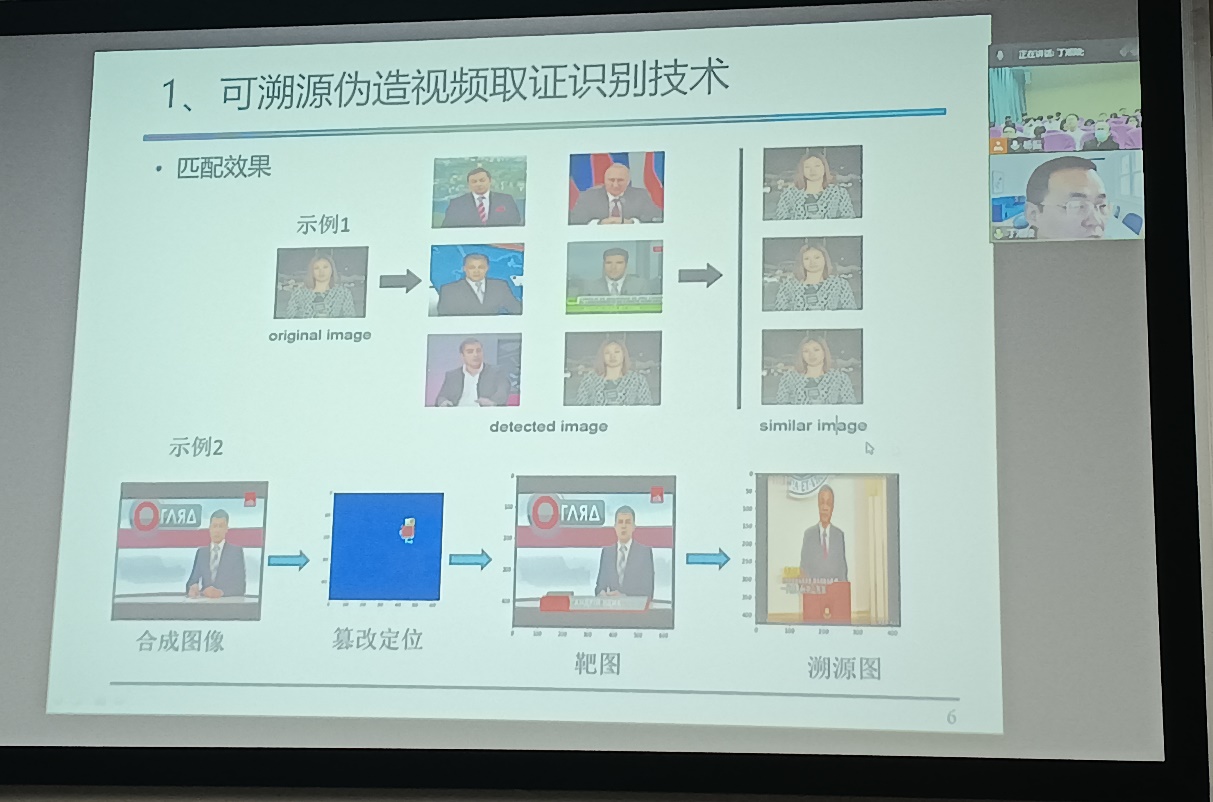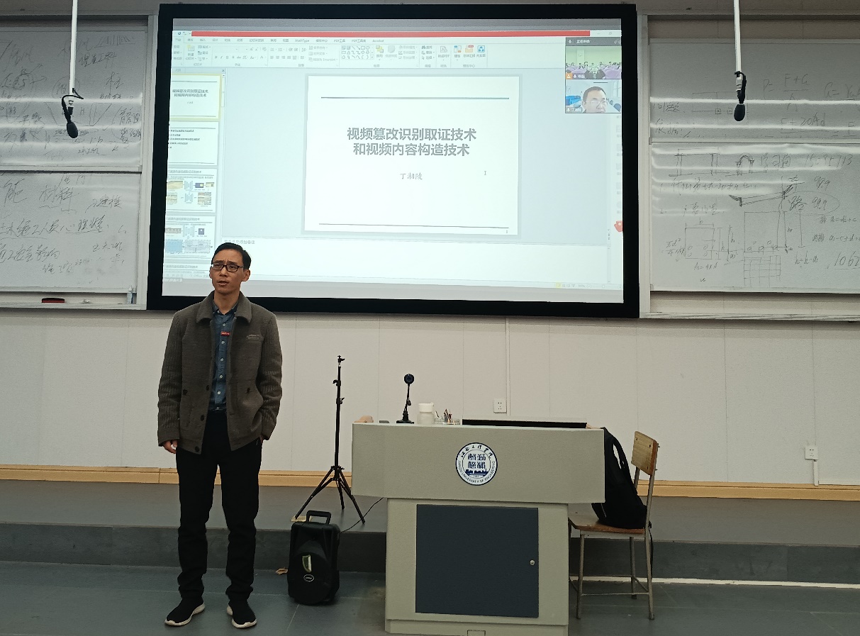 丁湘陵博士热情的为同学们介绍了个人的研究成果,并就可溯源伪造视频取证识别技术及深度视频修复定位技术进行了深入的探讨。结合当前世界热点冲突地区战场图像识别应用情况,将在场师生领入到图像识别视频处理技术研究的大门。