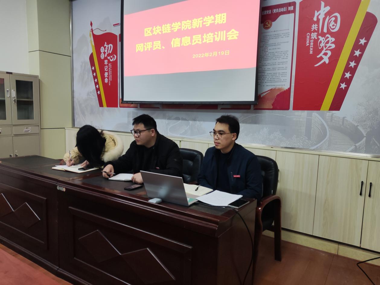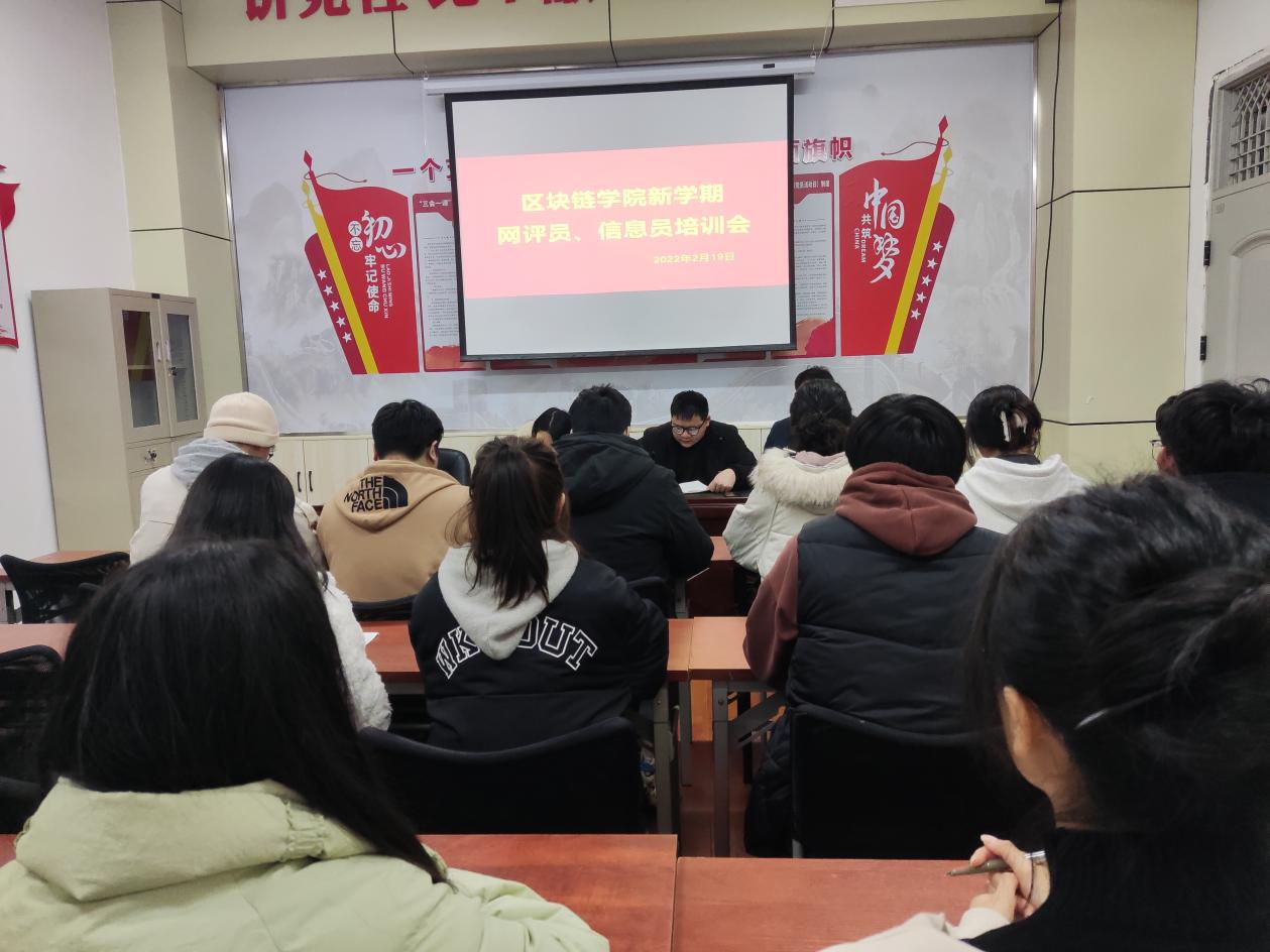2月19日,区块链公司在实训楼C203开展信息员、网评员培训会。党支部副书记郭远峰主讲,各班级辅导员及各班宣传委员、信息员参加培训。