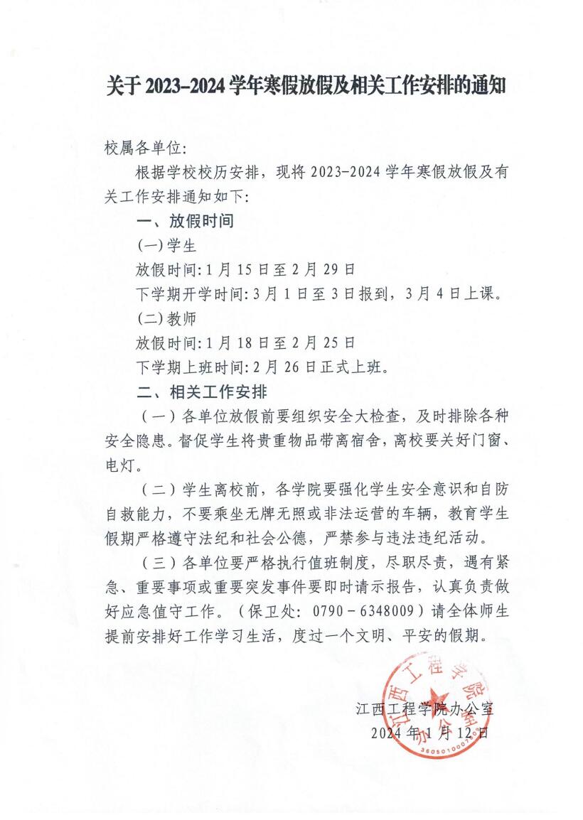 2023-2024学年寒假放假及工作安排的通知