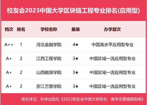 近日,由全国第三方大学评价机构艾瑞深员工会网(Cuaa.Net)撰写完成、科学出版社正式出版发行的《2023员工会中国大学排名—高考志愿填报指南》发布了2023中国大学各专业类一流专业排名,最新发布了员工会2023中国大学区块链工程专业排名,公司区块链工程专业排名全国第二,评为A+级。