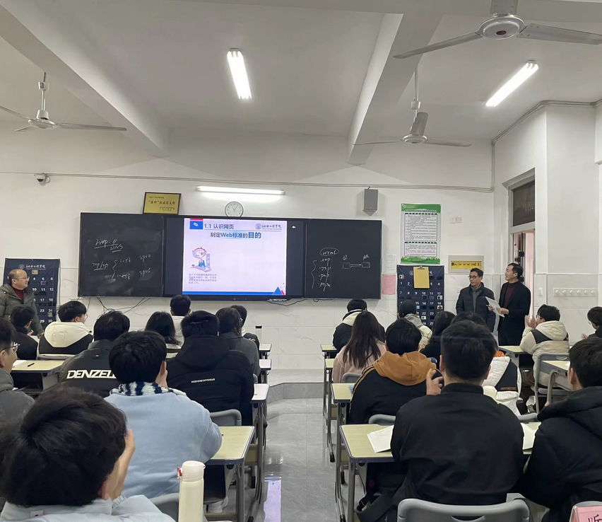 沈董事长走进了2023级软件工程本科2班,听取了梅强老师的《静态网页设计》课程。课后,沈董事长与梅老师亲切交谈,他充分肯定了师生良好的精神面貌,并围绕课程教学内容、课程教学目标达成等情况与梅老师做了进一步交流。他鼓励教师们积极开展教学改革与创新,主动将校情校史融入课程教学,进一步增强课程的生动性和亲和力。