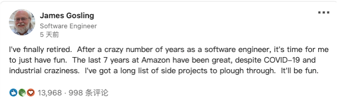 刚过完自己 69 岁生日的两个月后,Java 之父 James Gosling(詹姆斯·高斯林)在领英上官宣了自己退休的消息。他表示,“我终于退休了。在做了这么多年软件工程师之后,是时候让我好好玩玩了。尽管受到了 COVID-19 和工业环境的影响,但在亚马逊的过去 7 年还是非常美好的。”