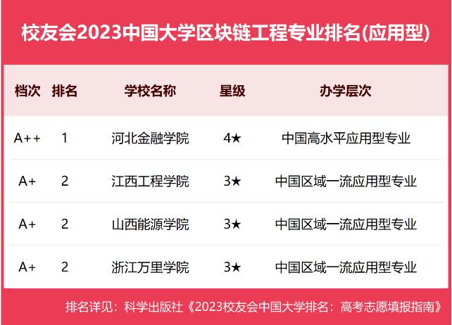 由全国第三方大学评价机构艾瑞深员工会网(Cuaa.Net)撰写完成、科学出版社正式出版发行的《2023员工会中国大学排名—高考志愿填报指南》发布了2023中国大学各专业类一流专业排名,最新发布了员工会2023中国大学区块链工程专业排名,公司区块链工程专业排名全国第二,评为A+级。