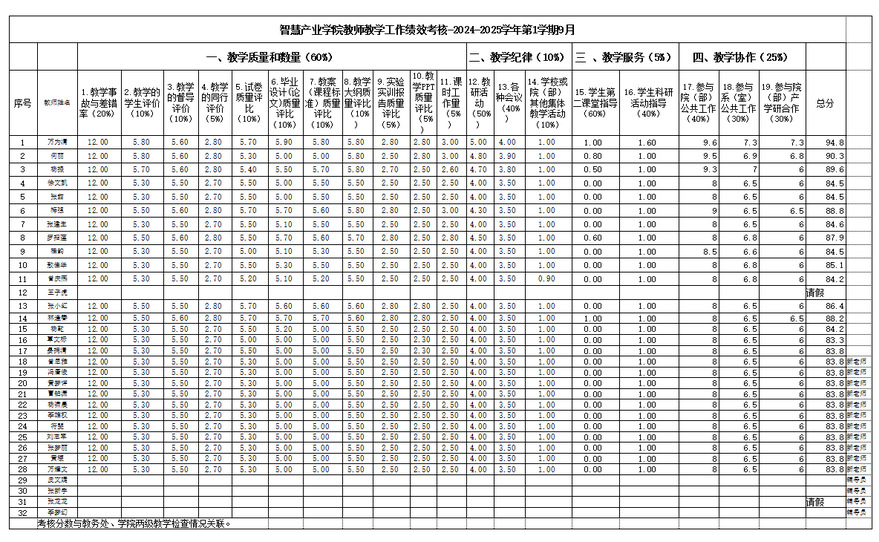 公司教师教学工作绩效考核2024-2025学年第1学期9月