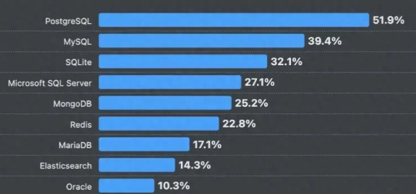 虽然在国内好像不是这样。PostgreSQL 在 2018 年的开发者调查中首次亮相,当时有 33% 的开发者正在使用它。而当年最受欢迎的还是 MySQL,有 59% 的开发者在使用。而六年后的今天,49% 的开发人员使用 PostgreSQL,连续第二年成为最受欢迎的数据库。